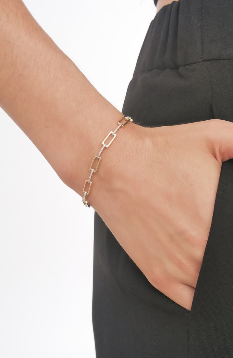 Pavé diamonds emphasize the sleek, sophisticated silhouette of this elongated link bracelet handcrafted in 18-karat gold.
