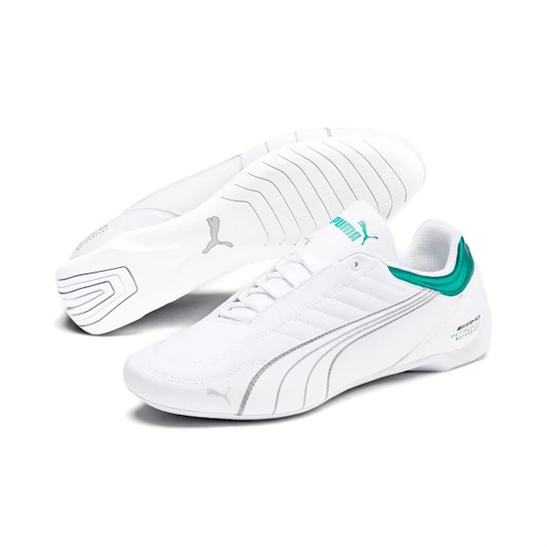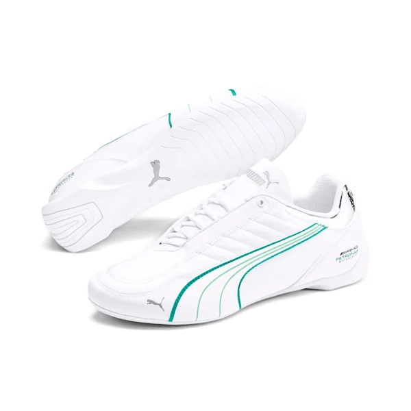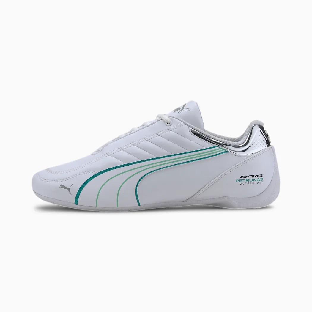 Two motorsport icons come together in the Future Kart Cat. The sleek silhouette of the Future Cat combines with the stitching design details of the Kart Cat in this versatile low-profile shoe. This version comes with authentic Mercedes AMG Petronas team colors and branding at the heel and a classic motorsport style for casual and die-hard Formula 1 fans.
