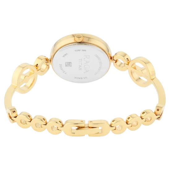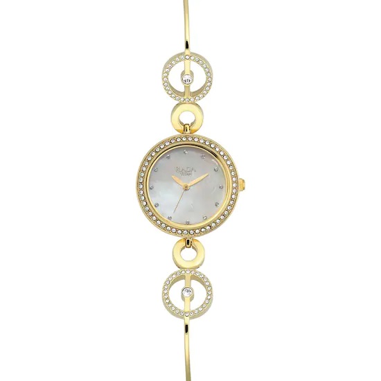 Description : Regardless of whether it is a nearby one's wedding or a merry event, be the focal point of consideration with this glamorous adornment around your wrist. The excellence of the rich metal tie is improved with its glossy gold-tone and embellishing Khabarovsk gems. While the mother-of-pearl dial accompanies comparative precious stone hour markers, the shining case is additionally studded with a corona of sparklers.